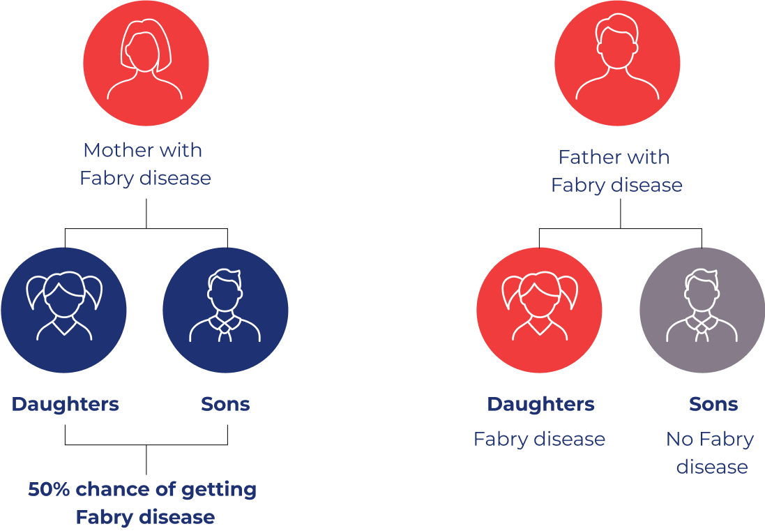 Fabry disease is a inherited disease. This means it is passed on through genes from your parents. Mothers with Fabry disease have a 50% chance of passing the Fabry gene on to their children. Fathers with Fabry disease pass on the Fabry gene to none of their sons and all of their daughters.9,10